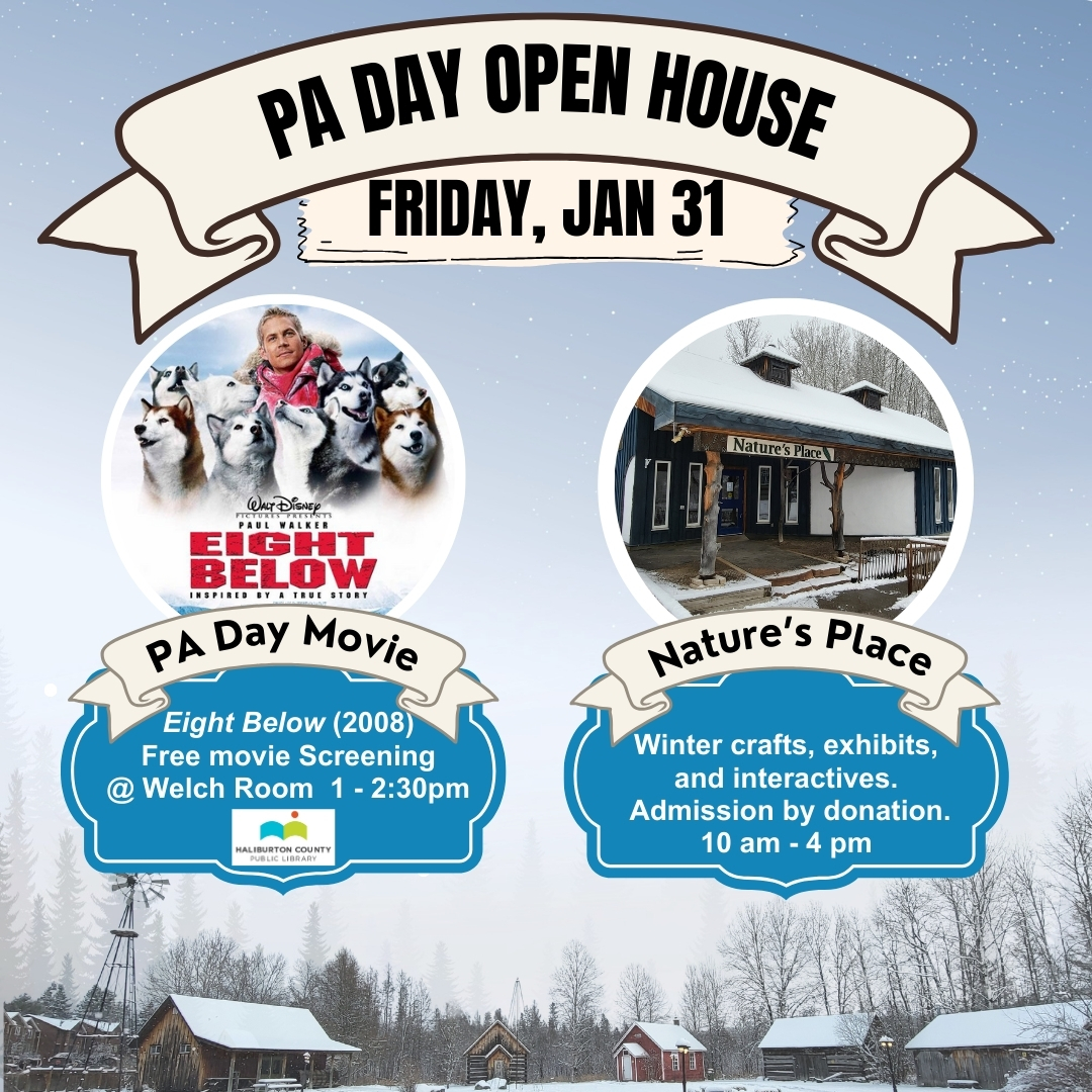 Don't miss the free screening of the movie Eight Below (2006) from 1:00 to 2:30 p.m., co-hosted by the Cultural Centre and the Haliburton County Pulbic Library – Minden Branch. Light refreshments will be provided, but feel free to bring your own snacks. Enjoy this thrilling and heartwarming movie about courage and friendship, perfect for a cozy day off from school!