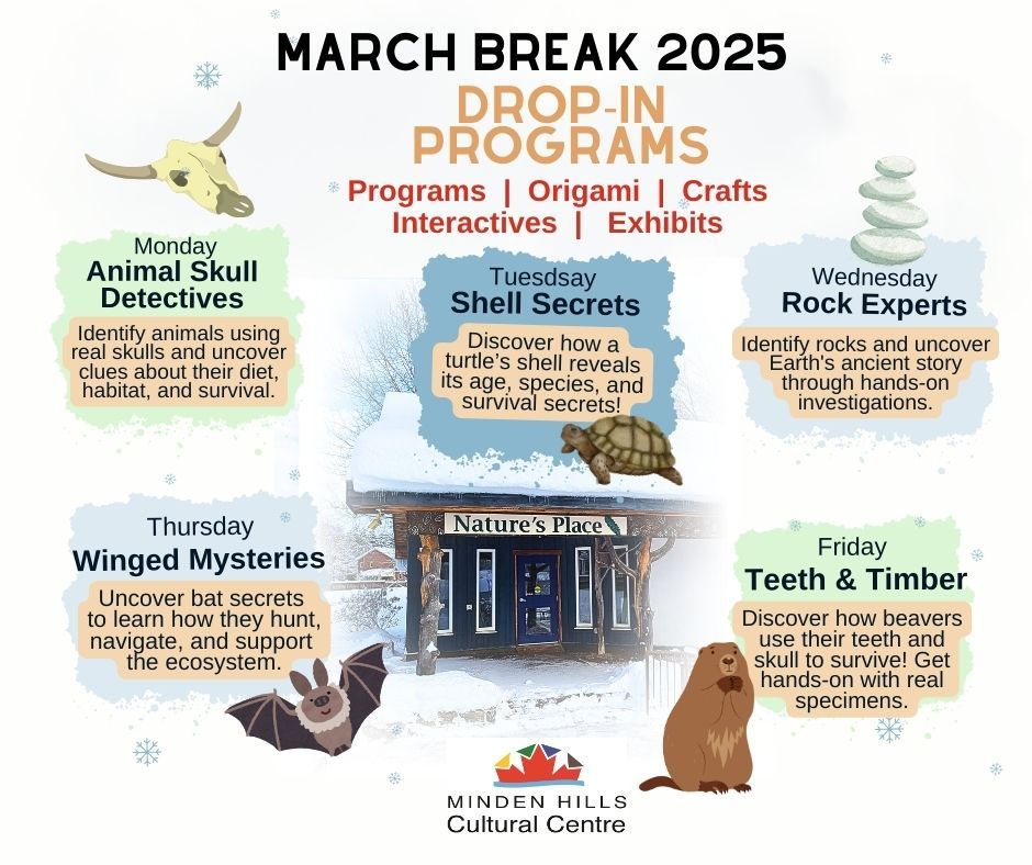 March Break Drop-in Programs are available at Nature’s Place at the Minden Hills Cultural Centre from March 10 to 14 (Monday to Friday) between 10:00 a.m. and 12:00 p.m. Admission is by donation, and no pre-registration is required. Suitable for...